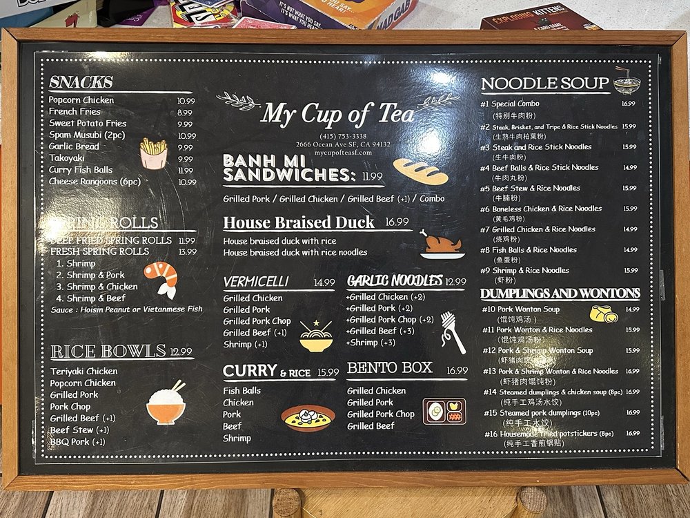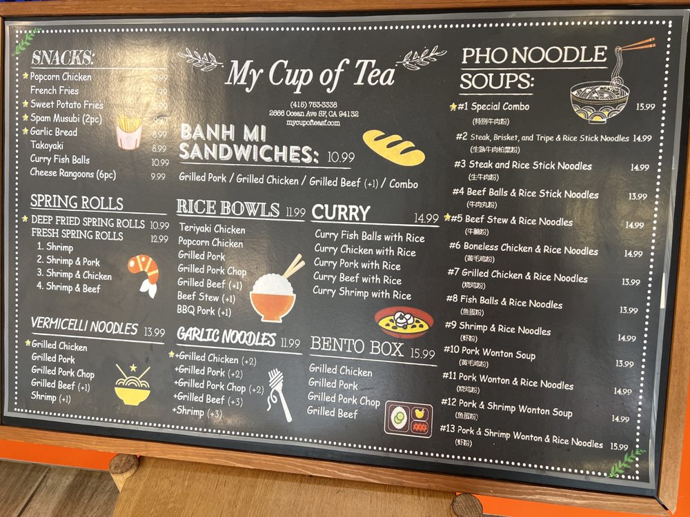 My Cup of Tea, a Vietnamese brand located in San Francisco, offers a diverse menu with popular drinks like the Coffee Delight and Grapefruit 101. Their new drinks, such as the Coffee Milk Tea and Fruity Black Tea, bring a unique twist to traditional favorites. The Grass Jelly Roasted Milk Tea tops the sellers list, showcasing the perfect blend of flavors. With a classy ambiance, free Wi-Fi, and gender-neutral restrooms, My Cup of Tea provides a welcoming environment for all customers. The variety of options, from classic teas to innovative creations, make this spot a must-visit for tea lovers seeking a delightful experience. The combination of high-quality ingredients and inviting atmosphere creates a memorable dining experience at My Cup of Tea.